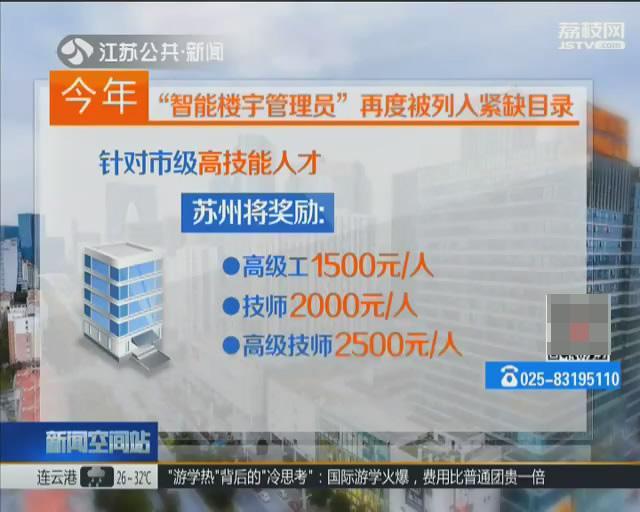 其实,早在2010年,智能楼宇管理员就成了紧缺工种,每年缺口约在5000到1万人。为此劳动部门展开“智能楼宇管理”培训,第一批招收30名学员。而随着苏州总部经济的火热,楼宇智能化水平的提高,今年,“智能楼宇管理员”再度被列入紧缺目录。针对市级高技能人才,苏州将给出高级工奖励1500元/人,技师2000元/人,高级技师2500元/人。