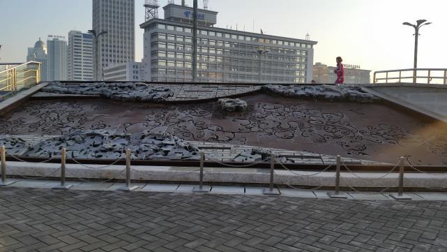 中部用天然石材铺砌而形成的面积达1521平方米巨大火凤凰展翅欲飞;中部南北两侧镶嵌两块取材于丝绸、书法、绘画、青铜、漆器的巨型浮雕,以"天人共舞"和 "射日传说"讲述楚文化的悠久历史;中部两侧青石浮雕以黄鹤楼、晴川阁、江汉关三座标志性建筑,与古今名人狂野豪放的草书浑然一体,喻意武汉三镇历史变迁及发展足迹;上部艳丽的花坛,跳跃的叠泉让人在厚重中感受轻松与明快。