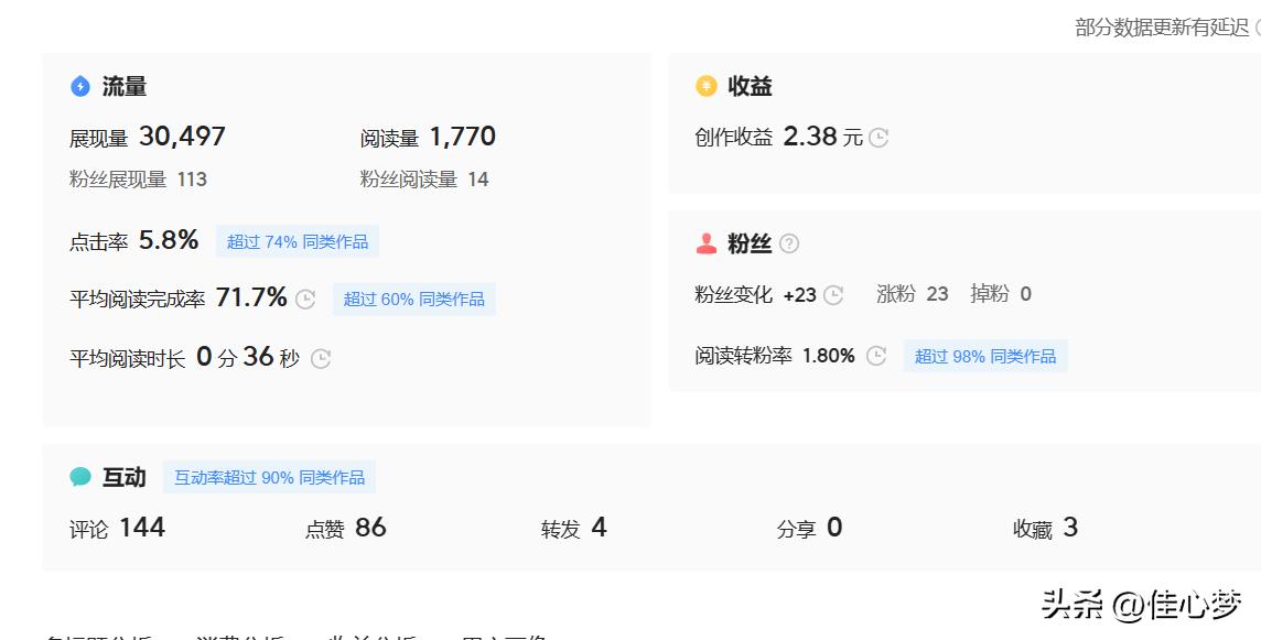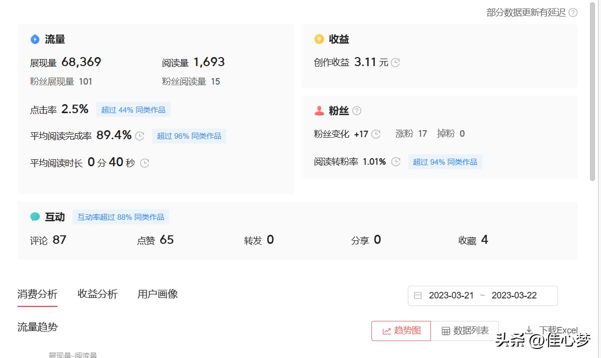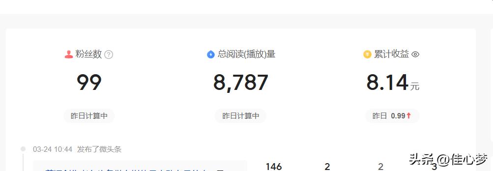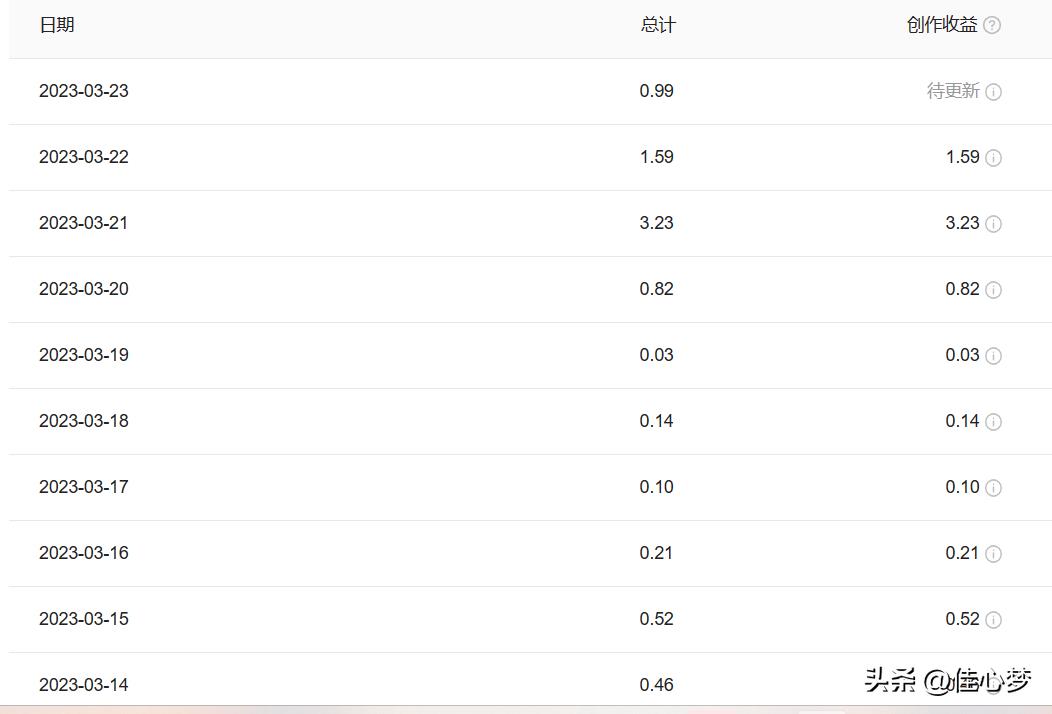 我从这个3月12号开始写的头条,截止到23号的,每天大概都能维持一天发一篇文章,每天收益也不一样,一般一篇文章推荐量只有刚发的那天多,后面基本就没了,当然了,这也不排除我写得不好的原因。