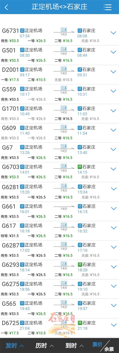目前,从石家庄火车站通达正定机场的高铁和动车共有12列,最早7:32,最晚20:49。从正定机场通达石家庄火车站的高铁和动车共有16列,最早7:54,最晚21:04。高铁二等票价16.5元,动车二等票价10.5元。