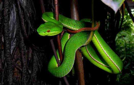 赤尾竹叶青也叫青竹蛇。是一种有毒的蛇类,别看长得颜值很高,但毒性很强烈,属于血循环毒性,咬伤之后会感觉非常疼痛。虽然致死率不高,但却能带来很大的痛苦。