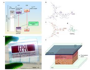 其阳极为染料敏化半导体薄膜(TiO2膜),阴极为镀铂的导电玻璃 。纳米晶体TiO2太阳能电池的优点在于它廉价的成本和简单的工艺及稳定的性能。