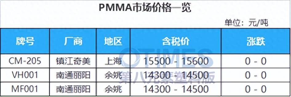华东PMMA市场区间运行,国货资源价格商谈在13600-14600元/吨;进口货源价格商谈在14000-15800元/吨,原料MMA价格暂稳,粒子工厂及持货商随行就市报盘,下游刚需采。