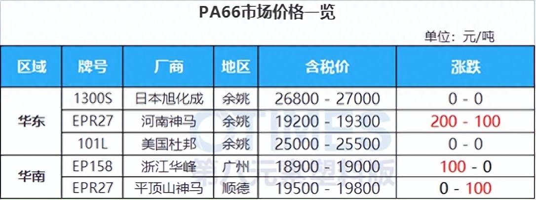 国内PA66市场继续上涨。国内工厂报盘推涨,持货商低价惜售。当前华东地区EPR27市场主流价参考19200-19300元/吨现金。旭化成1300S市场主流价参考26800-27000元/吨现金。