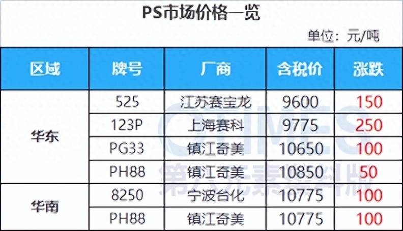 国内PS价格继续推涨。华东普通透苯价格参考9600-9750元/吨,普通改苯价格参考在9950-10100元/吨。原料苯乙烯继续推高,PS成本端支撑强劲,持货商部分惜售观望,买盘亦观望为主,交投冷清。