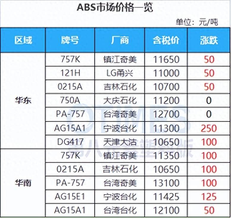ABS市场走高。截至目前部分国产料价格主流参考10600-11300元/吨。原油和苯乙烯连涨叠加厂家持续挺价,主流市场气氛升温,持货商心态向好。午后随着苯乙烯盘面宽幅上涨,商家陆续减少报价,惜售心理增浓。