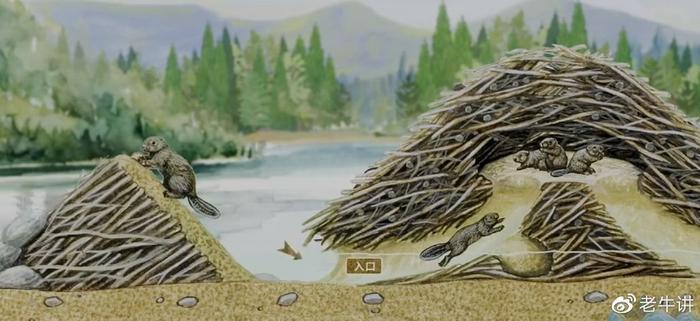 一般动物巢穴的出口大多不是朝前就是朝上,而河狸巢穴的洞口朝下,隐没在水中,非常隐蔽,能有效把天敌防御在巢穴入口之外,入巢之后首先抵达一块铺有木屑的平台,类似玄关供它们抖落身上的水珠,而后再经过一条较长的通道。