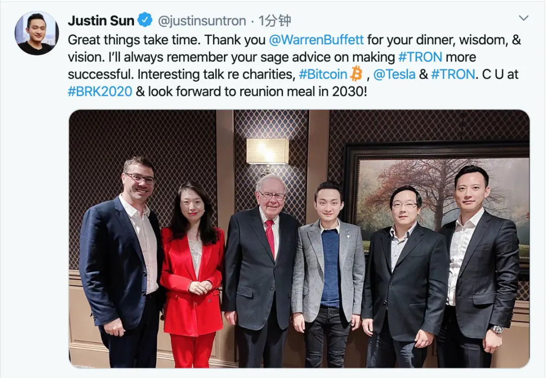半年后,这顿饭终于吃上了,孙宇晨还表示,他送了一个比特币给巴菲特。