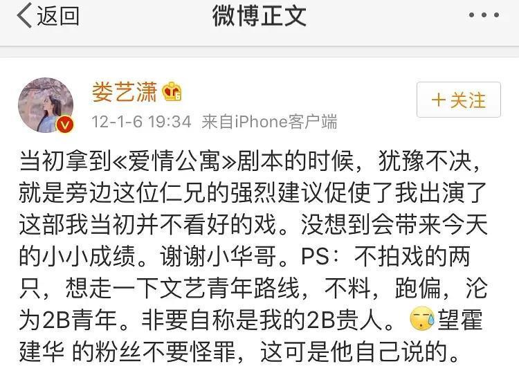 这就不得不又提到红极一时的《爱情公寓》了。当娄艺潇接到这个剧本时,犹豫不决,是华哥让她接下胡一菲这个角色,使她演艺事业一部飞升。因此,两人关系更加密切,霍建华还自称是其“2B贵人”!