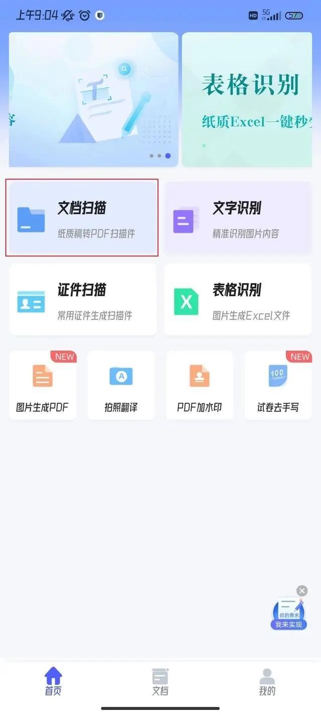 1、首先需要在自己的手机上安装好“风云扫描王”软件,然后将其打开,注册后登录进入首页,点击【文档扫描】功能并进入;