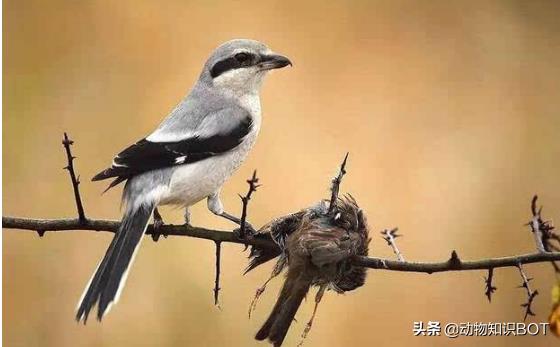 伯劳是将猎物刺穿悬挂在尖锐处晾着,然后在用鸟喙撕下肉块享用。