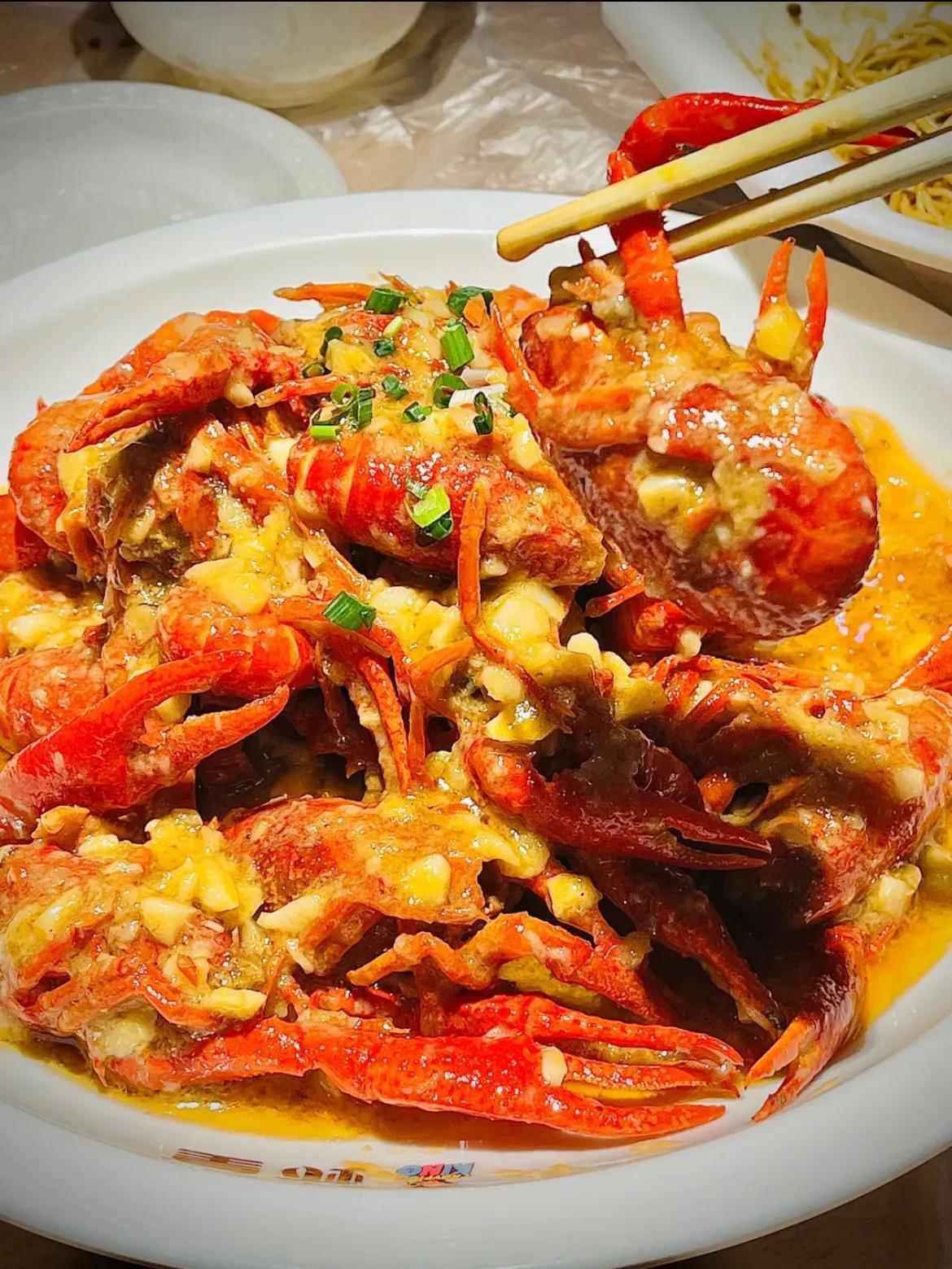 巴厘龙虾的的口味也是偏甜口的,虾肉入味,油比较厚,辣椒看着很辣,却不辣,非常入味儿,蒜蓉龙虾也是很多食客的爱。
