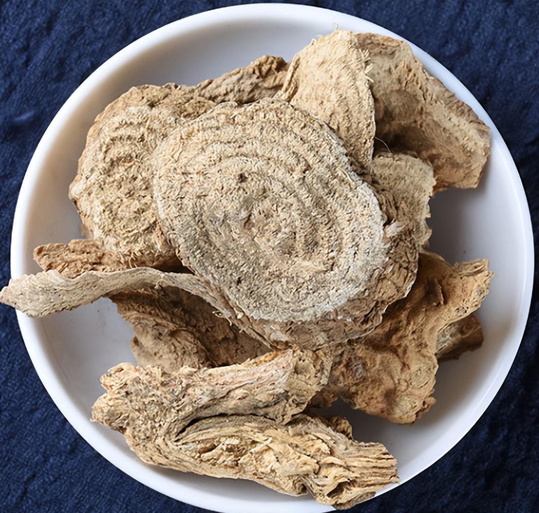 3、山莨菪:为茄科植物山茛菪Anisodustanguticus(Maxim.)Pasch.的干燥根。本品常横切或纵切成厚片。直径5~8cm,厚0.5~0.8cm。外皮灰黄至灰棕色,粗糙。切面灰黄色。质硬,折断呈粉性。皮部薄,色稍深,木部发达,色稍浅,有5~10轮密集的环状纹理。气微,味苦。