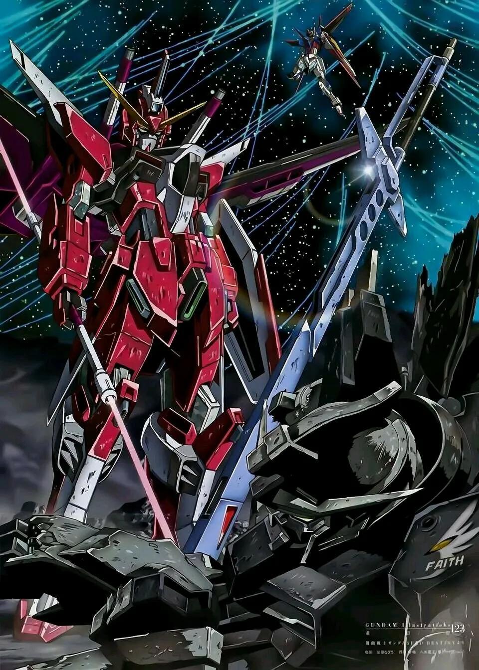 无限正义高达作为正义高达的后续机体,充分发挥了阿斯兰•扎拉的近战优势,与强袭自由相配合阻止了杜兰达尔的“命运计划”。