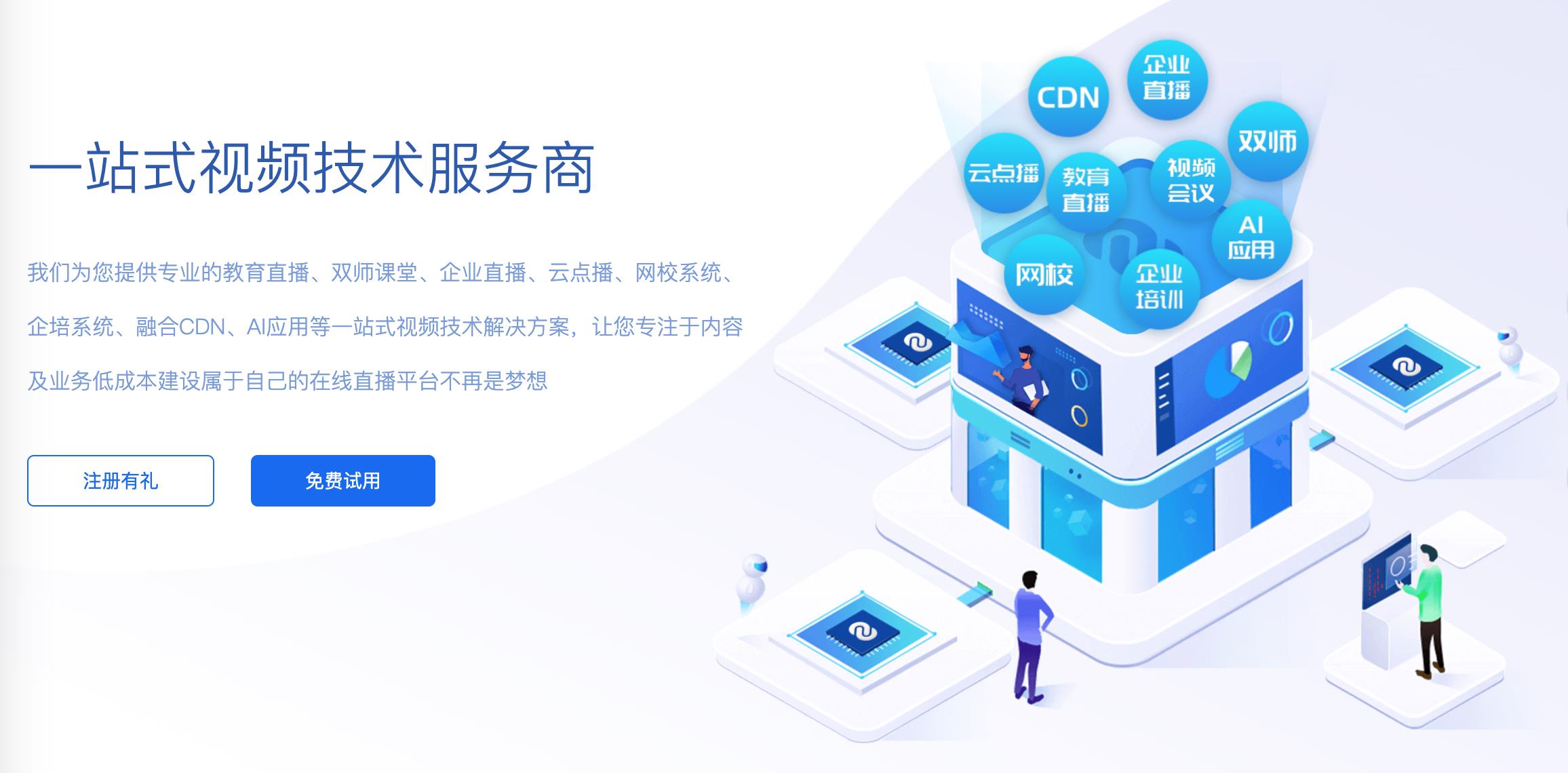 满足各类直播场景,提供专业的教育直播、双师课堂、企业直播、云点播、网校系统、企培系统、融合CDN、AI应用等一站式视频技术解决方案。