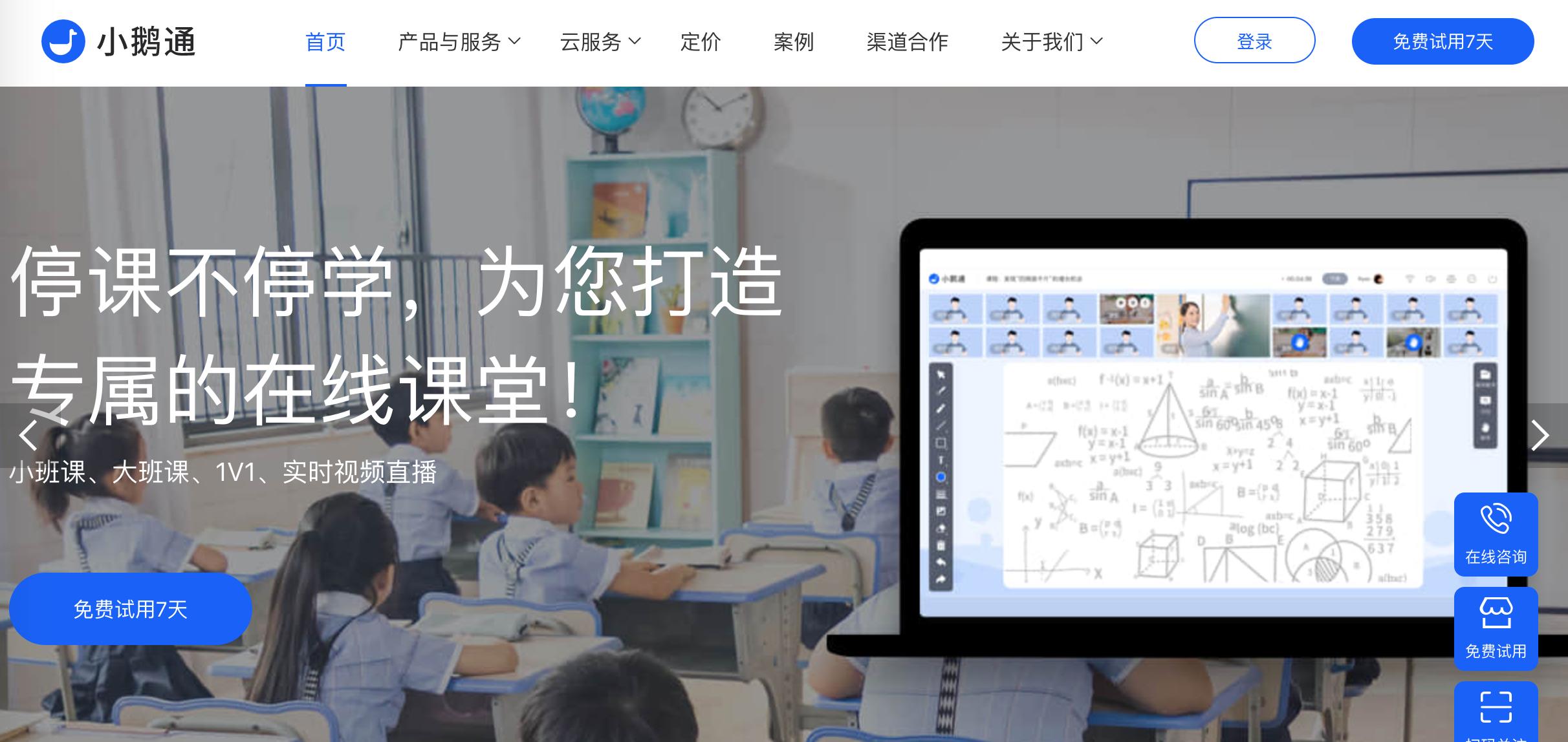 主要功能有:双向白板、课堂题板、在线答题、实时聊天、云端存储、数据可视化、网校管理等。