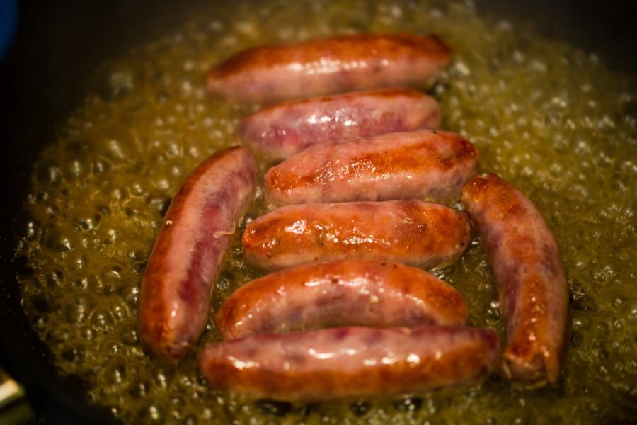 冷锅时先加入少许油和香肠,将两边煎得有点金黄色,再倒入一米杯的水,利用水及油将香肠以半煎半煮的方式煎熟,同时维持香肠的湿润和外皮的焦香(油水比例是 1小匙油+1米杯水)。