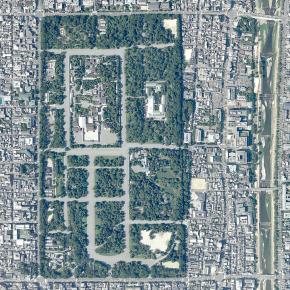{上图1为三星堆古城外鸭子河的地理位置,图2为日本京都的鸭川河,图3为京都的日本皇宫}
