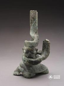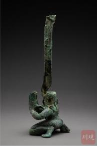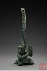 在上图三星堆青铜鸟的尾部,还浮雕有一个弯腰鞠躬的青铜器人像,叫做仆{
