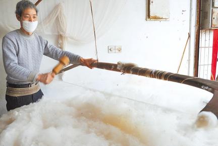{上图1为中国人在弹棉花。图2为三星堆立缨冠冕的青铜器人像}