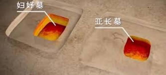 {上图1为殷墟遗址的妇好,图2为妇好与亚长的墓葬,距今3230年前后}