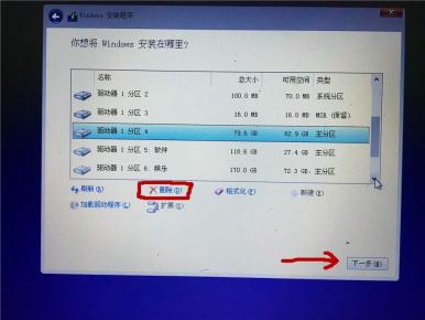 选择好安装分区,先点击【删除】按钮,这样就形成了一个空闲区,否则无法安装。点击【下一步】开始安装。