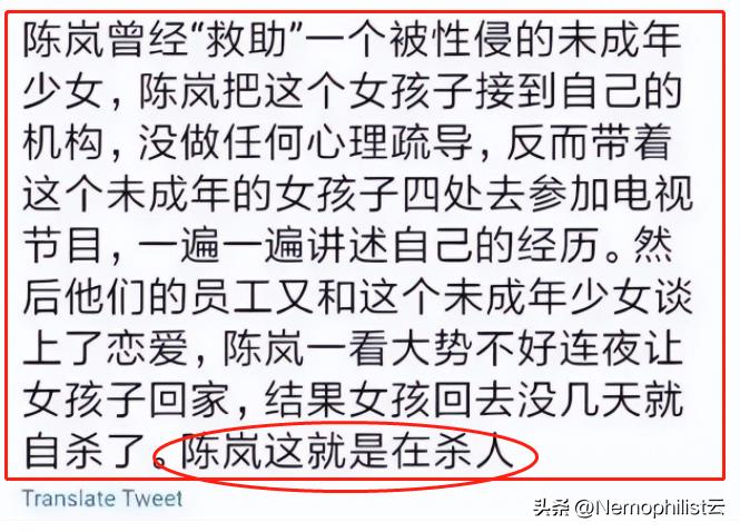 原因是陈岚带这个女孩去参加一档节目,按照陈岚的想法是想激励她不要自卑,要光明正大活在阳光下。但是这个女孩可能觉得是全国人民都知道了她被那样了,一方面孩子的年纪很小,另一方面心里承受不住社会的压力,于是选择自杀了。