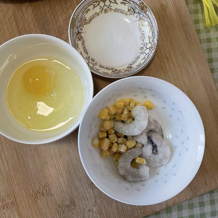 用料.鸡蛋1个,盐 少量克,虾仁 3克,玉米粒 3克。