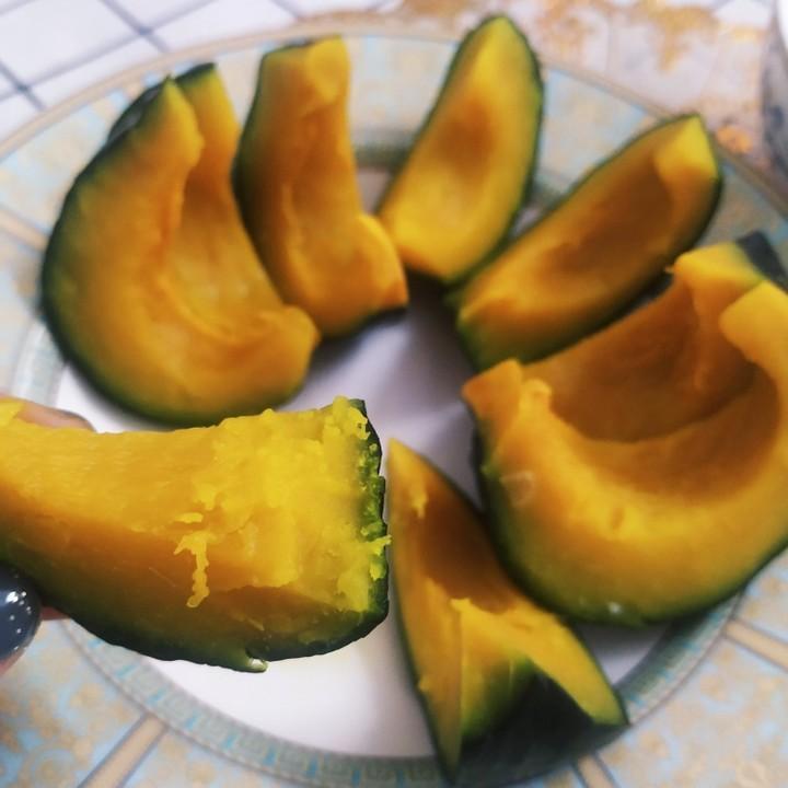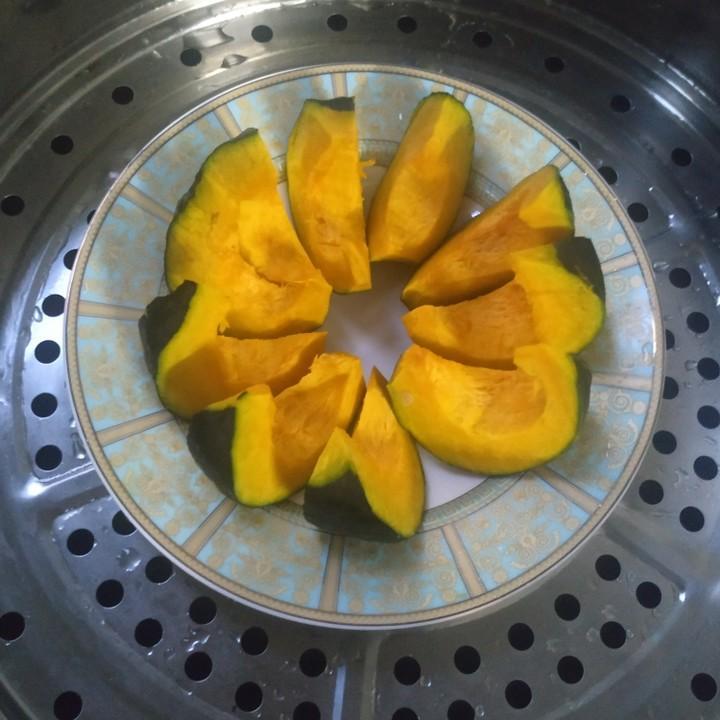 沿着南瓜纹路切开,挖嚷去籽上碟子放蒸笼蒸熟,水开了中大火蒸15分钟即可