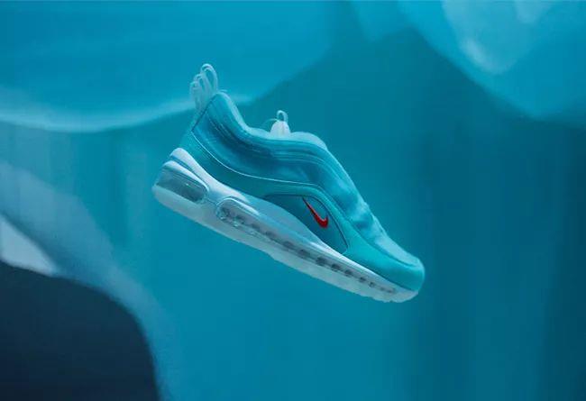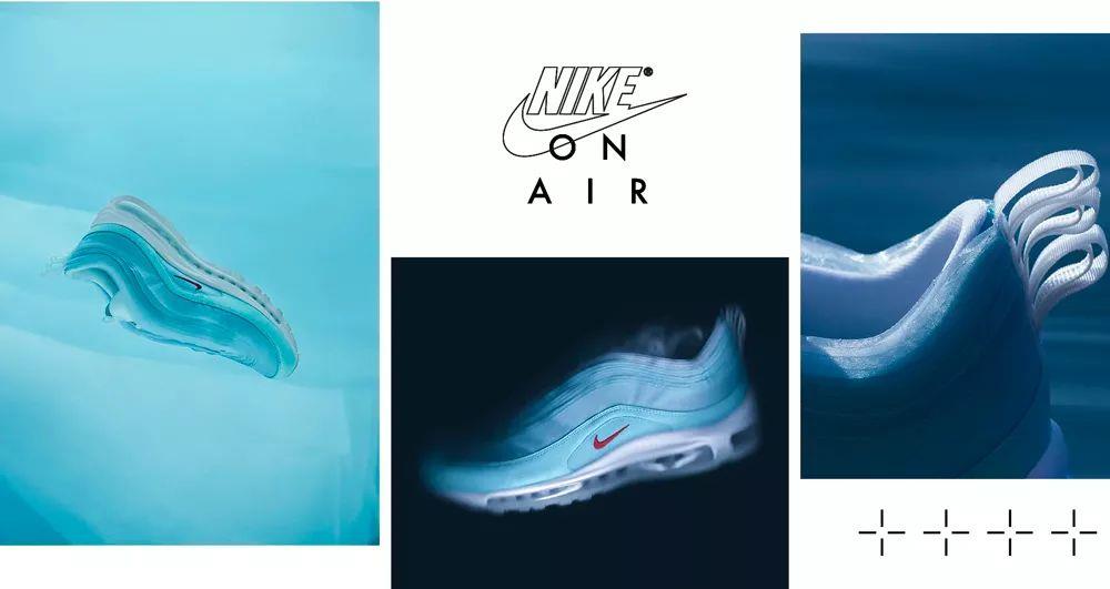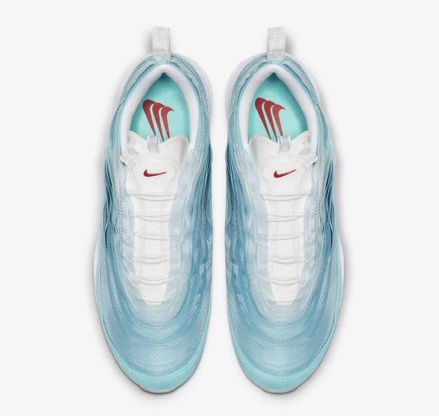 设计在 Air Max 97 的基础上,将鞋面使用一层层浅蓝色透明蝉翼拼叠,由中底向鞋带周围汇拢,如同云层般绵延。鞋舌及后跟同样层叠着多层白色透明提带,形状如同水花溅起。