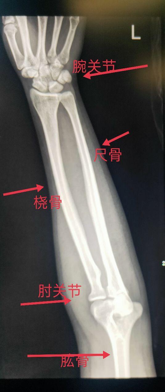 在尺、桡骨正位片上可以看到尺骨、桡骨、肘关节(部分肱骨、鹰嘴窝、肱骨滑车、肱骨外上髁、肱骨内上髁)、腕关节(手舟骨、月骨、三角骨、豆状骨、大多角骨、小多角骨、头状骨、钩状骨、部分掌骨)。