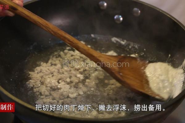 5.然后另一锅放入清水200克左右,把切好的肉丁焯下,撇去浮沫,捞出备用。