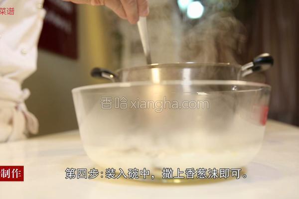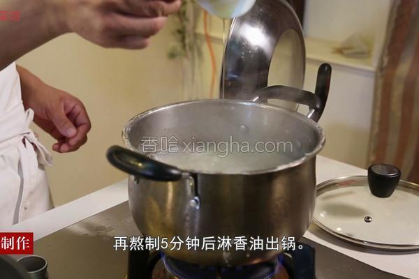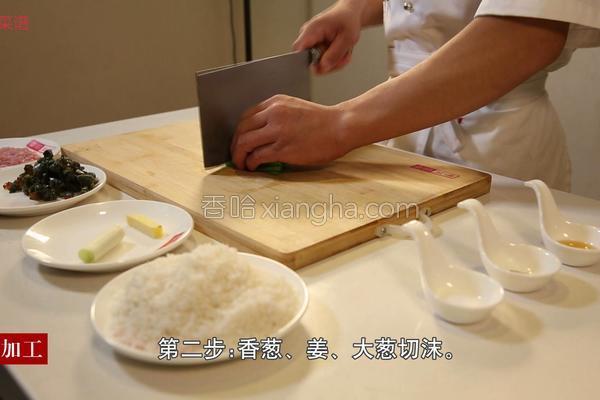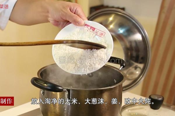 4.锅中下水1500克,大火烧开,放入淘净的大米、大葱沫、姜,改中火炖。