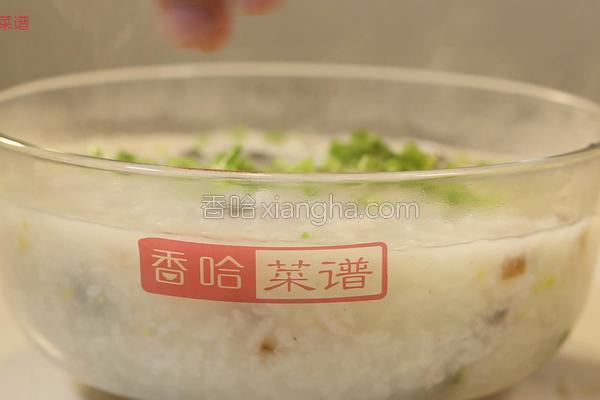 皮蛋50克、大米300克、瘦肉50克、香葱10克、姜10克、大葱10克、盐15克、胡椒粉5克、香油8克