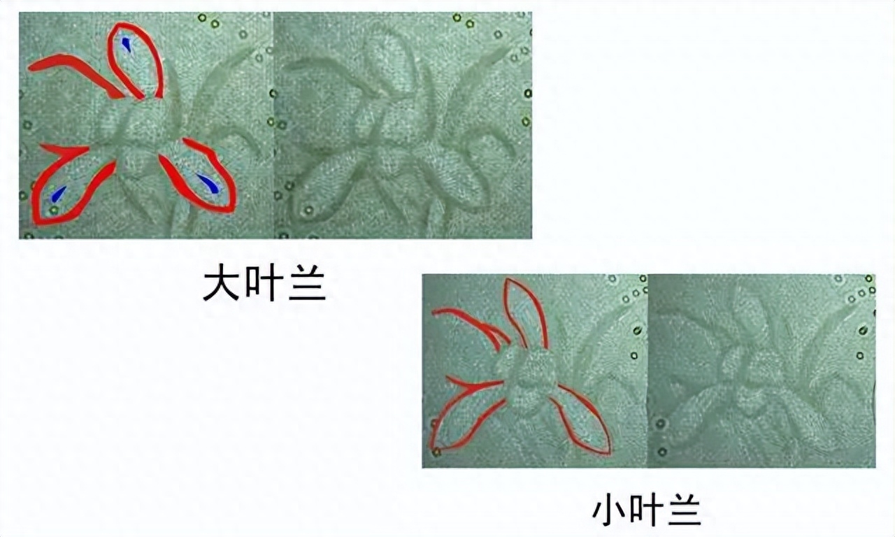 2. 大叶兰水印外三花瓣比小叶兰水印大、并且是圆顶,小叶兰外三花瓣细长,并且是尖顶;