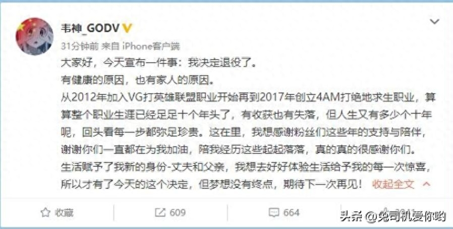 尽管大家都不愿意看到韦神真正退役,但是这一天还是到来了。Godv在自己的微博上正式发布了退役的消息,4am的传奇队长职业生涯宣告终结。作为横跨LOL与PUBG两大电竞项目的传奇选手,韦神也终于走完了他长达十年电竞职业生涯。