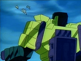 当通天晓从基地监视器中发现了局面不利时,马上派出飞行太保(Aerialbot)支援擎天柱。有了空中力量的加入汽车人迅速就击溃了大力神