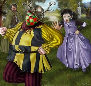 "傻子血,国王血,处女大腿也流血,链子拴宾客啊,大人,链子拴新郎啊,我知道,我知道,噢噢噢!"——补丁脸。