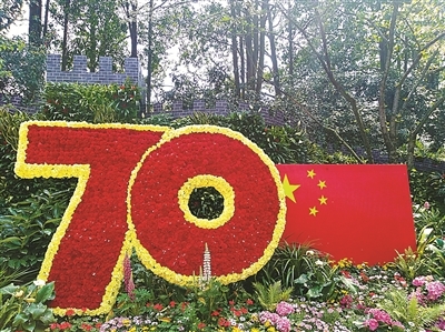 在杭州太子湾公园正门口,花卉拼凑成“70”的字样,寓意中华人民共和国将迎来70周年华诞。