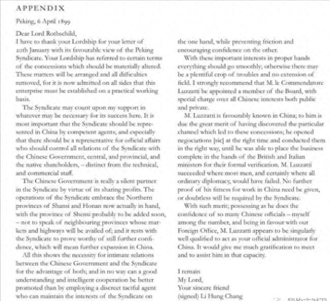 1899年,李鸿章亲自写信给罗斯柴尔德汇报工作情况,信中这样写道:这个辛迪加可以依赖我的支持—这种支持也许对辛迪加在华取得成功是非常必要的,更重要的是,辛迪加在大清必须有一个十分胜任的管理者;尤其应该是一位官方事务代表,能够掌控辛迪加所有同大清朝廷、各省和本地股票持有者的公共关系,这是超越技术和商务之上的。大清朝廷仅仅作为辛迪加的隐形搭档,而不共享利润。目前辛迪加的运营已包括掌控北部的山西省和河南省,不久陕西省也可能纳入其中,其他相邻省份的市场和公路也将被包括进来。辛迪加应该表明更远大的信心,这将使得其在中国的事业会有更进一步的拓展空间。大家细品,原来李中堂是个带路党啊!西方有传言称李鸿章中年时期经英国共济会会员介绍,加入共济会,成为其在华代理人,并因此得到了洋人的支持,将淮军打造成一只使用新型火器的军队,这也成为北洋军队的前身。细思极恐啊!