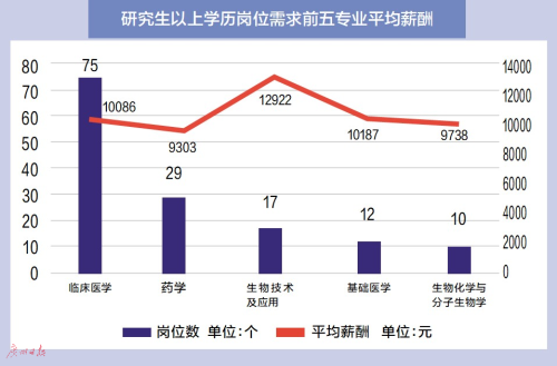 数据显示, 大专学历专业需求最大和专业薪酬最高的都是市场营销,平均薪酬为4996元;本科学历中岗位需求最多的是市场营销,平均薪酬最高的是临床医学达7739元;从研究生以上学历岗位需求专业分析,可看出硕士学历中医药类专业的需求量最大,其中临床医学的需求最大,生物技术与应用的平均薪酬最高为12922元,而总体平均薪酬则在9500~10500元之间。