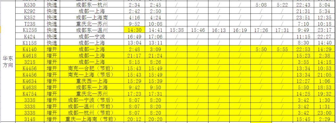 成都—上海K4140、K4618、3218,南充—合肥(节前)K4456,南充—上海(节后)K4456,重庆西—上海K4634,成都东—上海K4638,重庆北—苏州K4754,成都—宁波(节后)3338,成都—温州(节前)3338,成都—杭州(节前)3338,重庆—上海南(节前)3148。