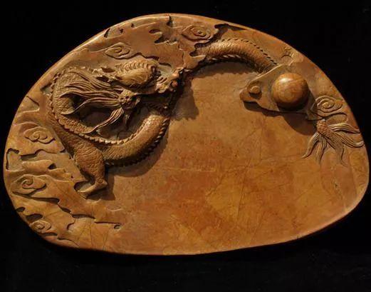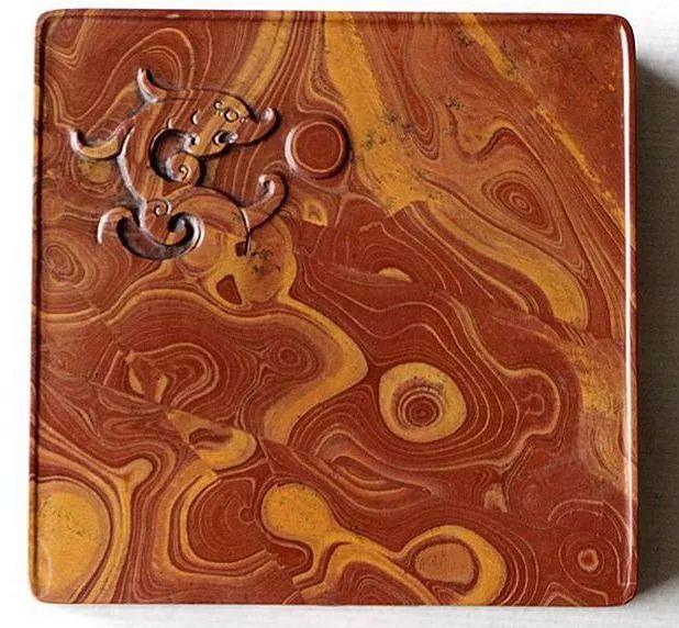 3、变化莫测的纹理。石可先生曾为红丝砚题刻砚铭“谁持彩练当空舞”,就是对红丝石曲线纹理的形象比喻。红丝砚纹理极具变化,文字、动物、山水、人物等图案都在似与不似之间,使人产生无尽遐思。