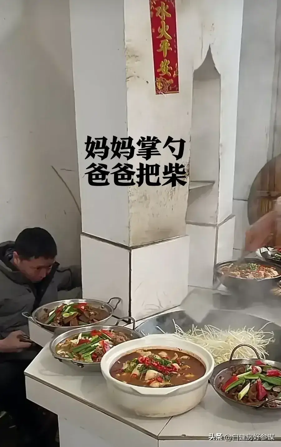 就像图上这样,妈妈掌勺爸爸把柴