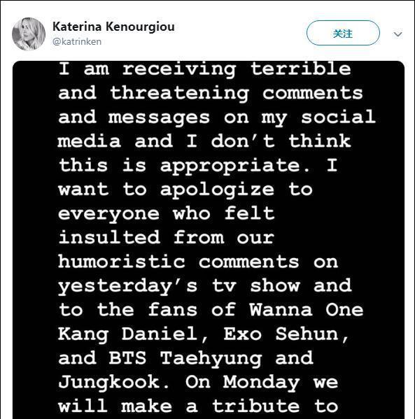次日,主持人发表声明,她表示:“我收到了网络暴力,收到了许多威胁性的留言,我觉得这并不得体!那些认为我的话是在侮辱人的,和EXO吴世勋、Wanna One姜丹尼尔、BTS田柾国、金泰亨,我对你们道歉。但我并不是种族歧视,我只是不太了解韩国明星罢了。”
