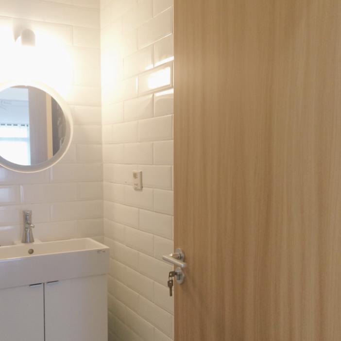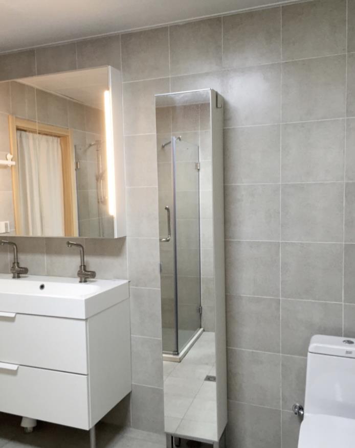 主卫的收纳功能要求更多,要保证水槽上干净无物,就需要把洗漱用的必需品存放在镜柜里。两组镜柜相当实用。