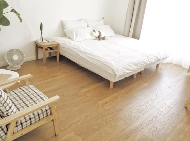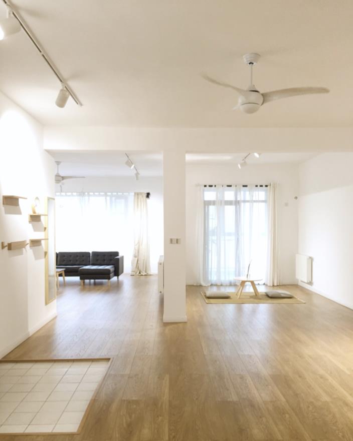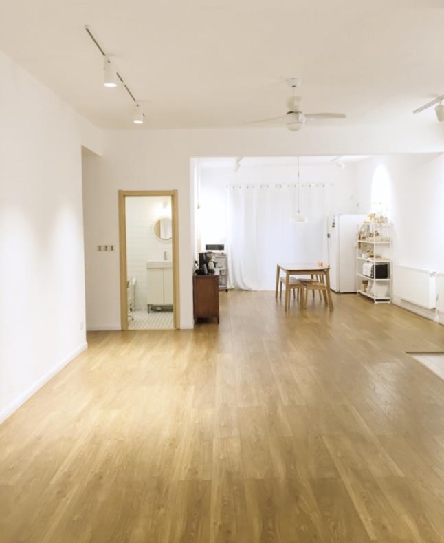 左侧是客厅和一个休闲茶室。全屋大白墙,几乎无吊顶,地面是纯实木地板非常环保。