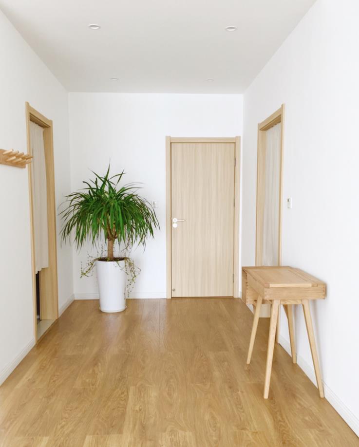 主卧的过道门口,左侧是主卫,正对着的是主卧门右侧是衣帽间门。摆放了一株龙血树,很是自然清新。