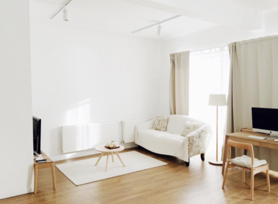 没有茶几的客厅,最初才入住时还有茶几和很多配饰,后来坚持断舍离后都赠送给朋友了,现在的客厅只用来休息。偶尔要放东西,可以用一个实用的小推车,客厅没有电视墙更没有电视机。