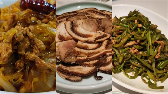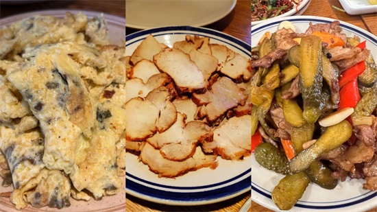 又是一家性价比超高的小店,除了炒合菜、香辣肉丝、酸菜炒粉等常见春饼配菜,老板还研发了一些创新菜,咸香椿炒蛋香味独特,熏梅花肉软烂有嚼头,喀秋莎酸黄瓜炒肉很是解腻。